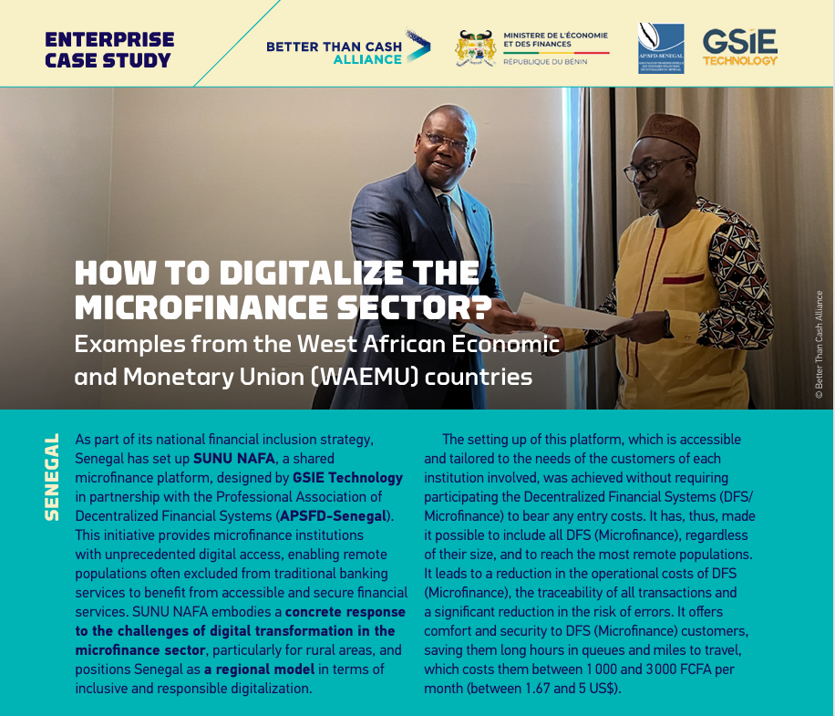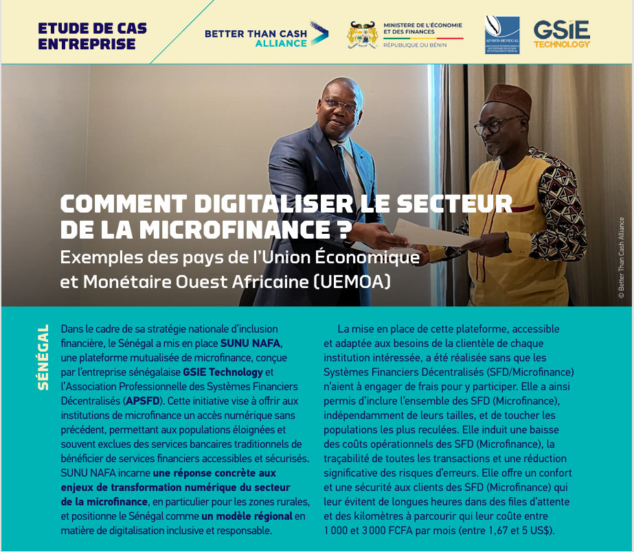 Consciente de l’importance de ces initiatives pour le développement du secteur, l’Agence Nationale de Surveillance des Systèmes Financiers Décentralisés (ANSSFD) s’inscrit activement dans une dynamique de coopération régionale et de partage d’expériences.C’est dans ce cadre qu’en septembre 2024, une mission d’échange entre le Sénégal et le Bénin, soutenue par la Better Than Cash Alliance, a été organisée.